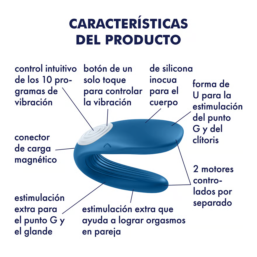 - Presentación: • 10 modos de vibración: 3 intensidades y 7 ritmos de vibración • Forma en U para estimulación de clítoris y del punto G • Modo susurro • 2 potentes motores